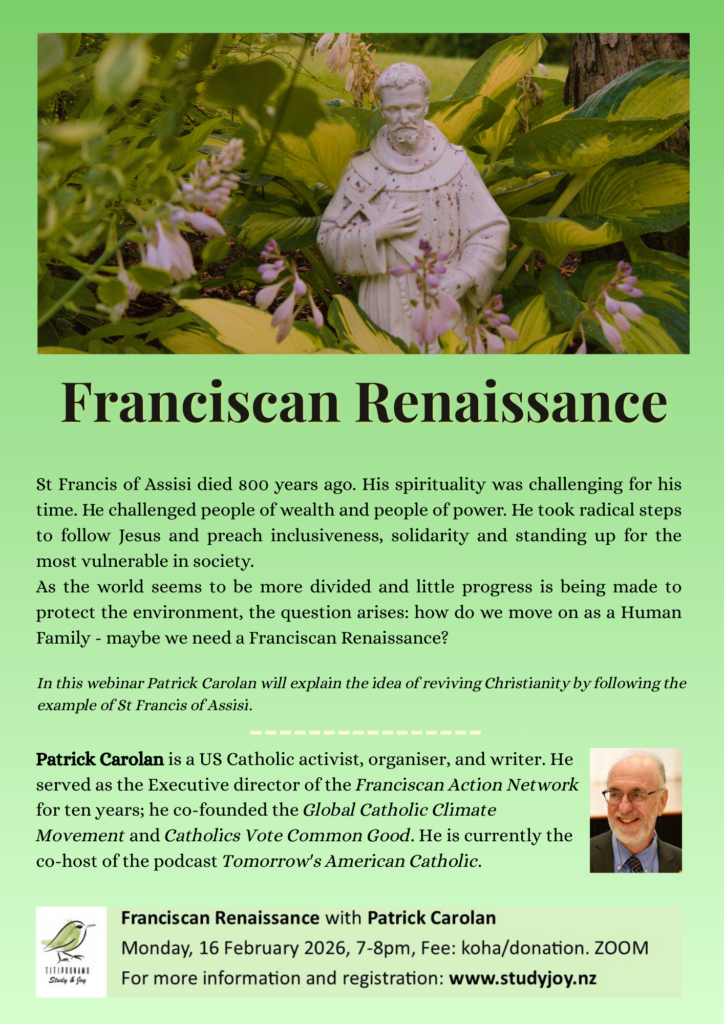 Franciscan Renaissance Post author:Beate Matthies Post published:January 8, 2026 Post category:Events / Presentations / Spirituality Registration to Participate Registration for Recording Tags: Franciscan Renaissance, Patrick Carolan Read more articles Previous PostMuffin Talk 2025 You Might Also Like RDC Webinar Series 2023 April 30, 2023 Bible Study Lockdown Initiative February 13, 2022 Matariki & the Pleiades June 21, 2022