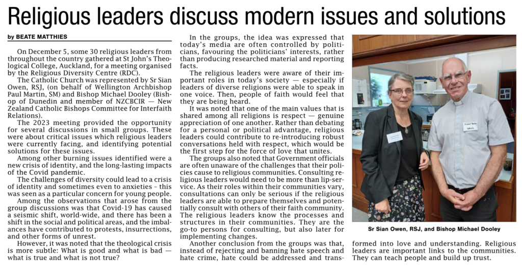 NZCBCIR Representation at RDC Event Post author:Beate Matthies Post published:February 25, 2024 Post category:Articles / Interfaith - Initiatives & Resources / News / Resources Published in NZ Catholic (Feb. 25 – Mar. 9, 2024) Tags: Bishop Michael Dooley, Interfaith, NZCBCIR, RDC Read more articles Previous PostMuffin Talks 2023 – Snippets Next PostDawoodi Bohra Muslims You Might Also Like Muffin Talk with Prof Douglas Pratt July 7, 2022 The Prodigal Son March 29, 2025 Richard Leckinger – Planet FM104.6 September 28, 2023