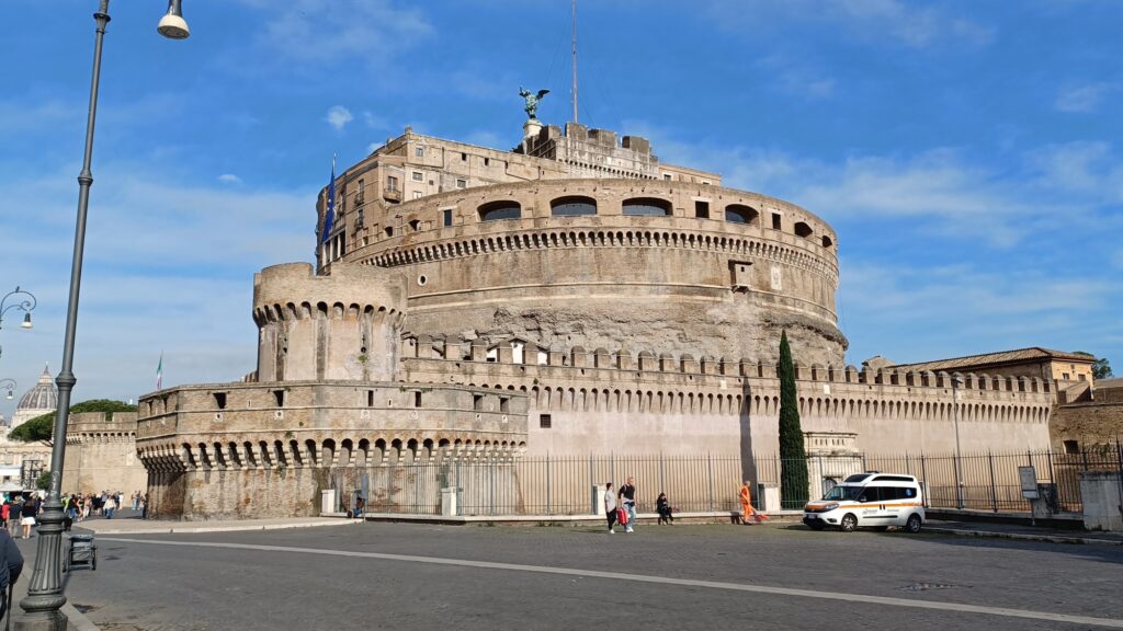 The bus drops off the pilgrims close to Castel Sant’Angelo, the Castle of the Holy Angel, and the pilgrims enjoy the early morning walk along the banks of the Tiber River and seeing this huge building that was intended to be a mausoleum of the Emperor Hadrian and his family. From the 14th century on, the popes lived in the castle or used it as a fortress, a place of rescue and later as a prison. Today, it is a museum.